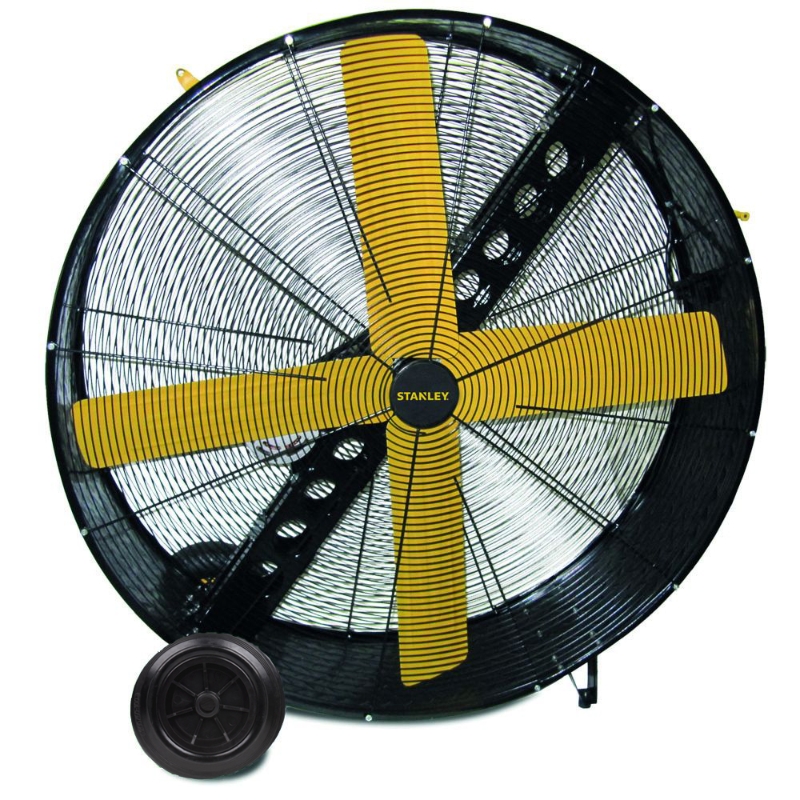 Ventilador de tambor de 2 velocidades, 4 aspas robustas montadas encima de una estructura sobre ruedas con carcasa metálica.