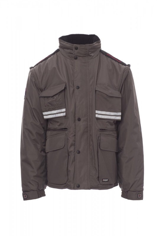 Chaqueta mangas extraíbles, capucha extraíble o plegable en el cuello y bandas reflectantes.